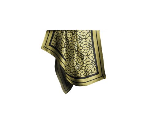 Jedwabna apaszka o wymiarach 90 x 90 cm z nadrukiem. Inspiracją projektu był wzór oryginalnej tapety z 1903 roku z Sali Arkadkowej w Pałacu Rodziny Poznańskich, który nawiązuje do tzw. rybiego pęcherza, czyli asymetrycznego ornamentu stosowanego w późnym gotyku.
