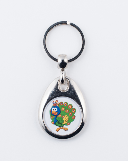 Metalowy brelok z rysunkiem Pawia Pafnucego, maskotki inspirowanej jednym z najbardziej charakterystycznych eksponatów w Muzeum Miasta Łodzi – rzeźbie pawia w Wielkiej Sali Jadalnej.