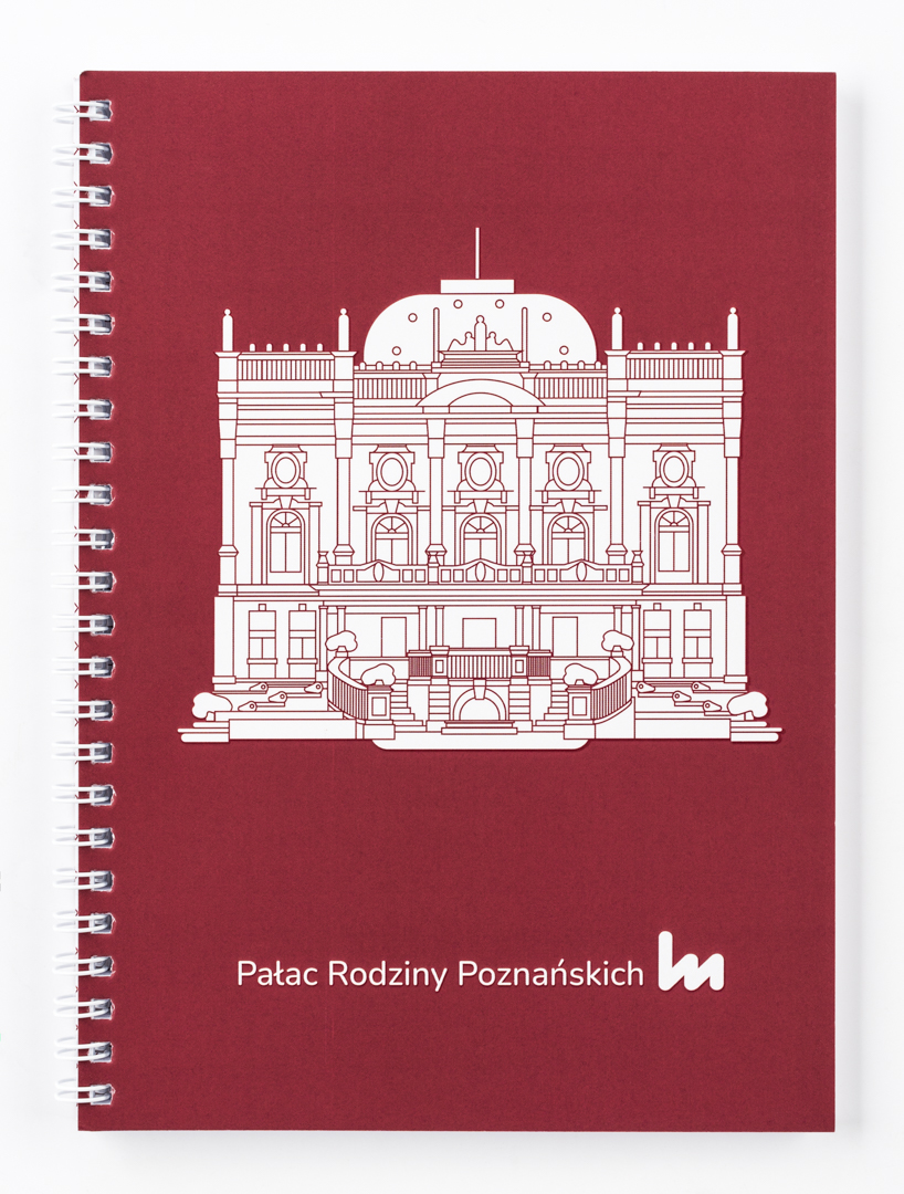 Bordowy notes z motywem architektonicznym pałacu z okazji 120 lat Pałacu Rodziny Poznańskich. Okładka tylna oraz strony zdobione wzorem inspirowanym pałacowymi oknami. Notes na sprężynie w formacie A5 z miękką kartonową, matową okładką i połyskującym zdobieniem. We wnętrzu 100 stron w kropkowane linie.